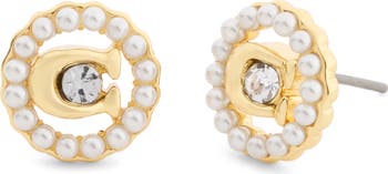 Elevate your everyday style with these eye-catching stud earrings complete with golden logos surrounded by faux pearls and centered with a sparkling crystal.
