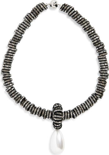 Pavé crystal rondelles bring stunning shine to a dimensional collar necklace suspending an elegant faux-pearl pendant.