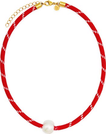 Sporty meets chic on this eye-catching rope necklace highlighted by a glowing faux-pearl pendant.