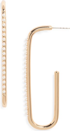 These geometric hoops modern the shape of your ensembles. Lines of faux pearls incorporate a classic glow.