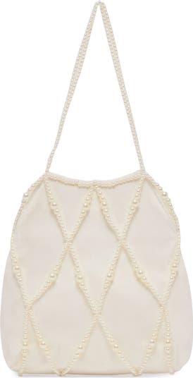 Glossy faux pearls cage a sweet satin bag that needs to go along whenever you have a special event.