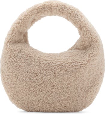Pillow-plush softness meets streetwear-ready glamour with this crescent-shaped handbag crafted from rich, curly faux shearling.