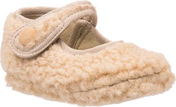 Plush faux shearling keep little feet warm and cozy on a charming flat featuring an adjustable mary jane strap for a secure fit.