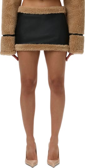 An edgy aesthetic shows its softer side with a wool-kissed faux shearling skirt cut to a leg-baring length.