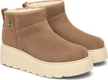 Contemporary style meets cozy comfort in this suede platform bootie lined with plush faux-shearling.