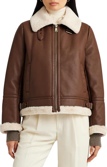 Plush faux shearling trims the collar, cuffs, hem and inner placket of this zip-up faux-leather jacket moto-detailed with a buckle throat latch and side tabs.