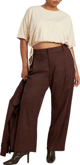 A high-rise faux-suede pant with a tailored fit and fluid full-length wide leg.