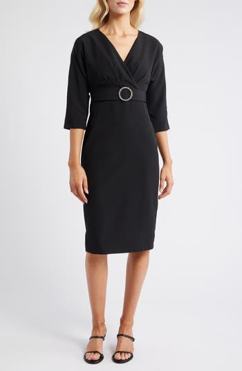 Sparkling hardware highlights the waist of this faux-wrap midi dress that's ready for cocktail hour.