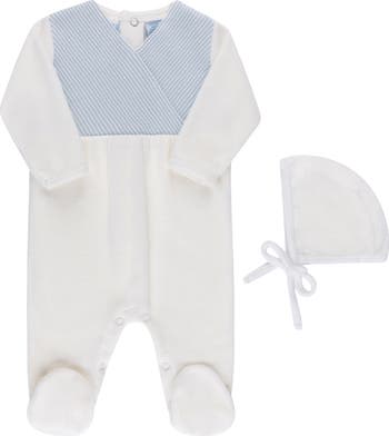 Wrap baby up in the softness of this cotton-blend velour set featuring a cozy footie that has a contrast yoke giving it a faux-wrap effect. It's paired with a matching hat for the complete look.