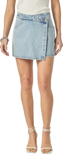 A faux-wrap front panel wiith glossy button adds a polished finish to this skort made of nonstretch denim for warm-weather days.