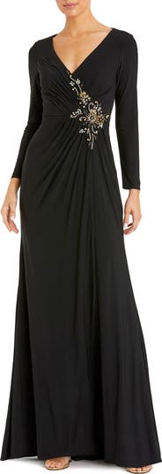 Faux Wrap Long Sleeve Appliqué Detail Gown