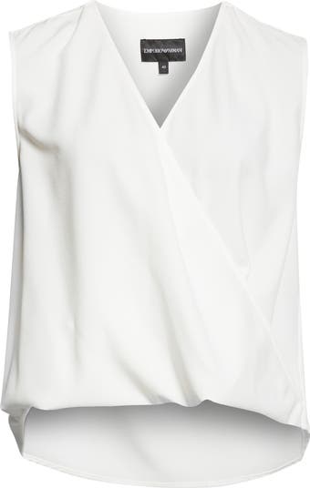 Cut from stretch crepe for comfort and movement, this minimalist shell is designed for easy layering with a faux-wrap silhouette and surplice neckline.