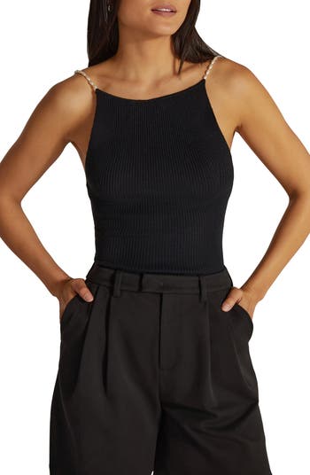 A night-out top seems already accessorized thanks to pearly straps that hold up the back-baring look.