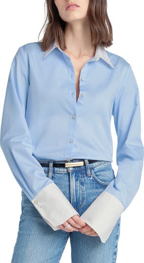 A contrasting collar and cuffs further the polish of this striped shirt cut from crisp cotton and finished with a curved hem.