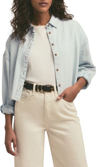 Dropped shoulders enhance the relaxed fit of a light-wash denim shirt updated in a cool cropped fit.