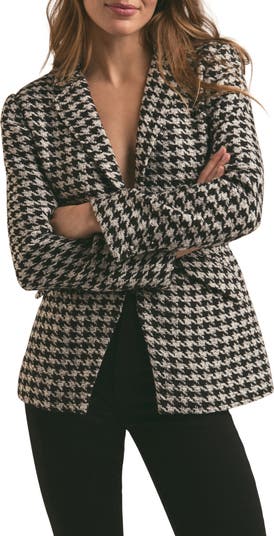 A classic herringbone pattern emboldens a woolly one-button blazer complete with fabric-covered buttons.