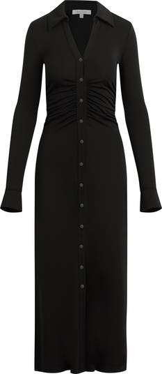 Rippled ruching shapes the figure-skimming silhouette of this polished shirtdress.