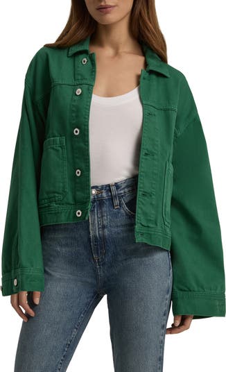 Patch pockets play up the utilitarian vibes of this denim jacket that's a fun update for your transitional-weather wardrobe in a vibrant emerald wash.