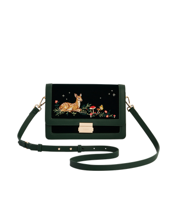 With a nod to forest folklore, this Crossbody Bag honours the gentle woodland deer. Curled up on a carpet of fresh fern amongst magical toadstools and stars, the fawn is a symbol of innocence, peace and serenity. In a deep green hue, internal compartments and a magnetic fastening for easy access this bag combines charm and practicality. You'll want to take it everywhere.