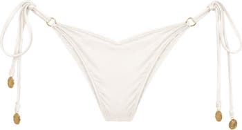 Faye is a luxurious satin bikini bottom that brings elegance to the beach. With its glossy white finish and custom gold charms, this style was made to turn heads.