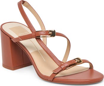 Slim, buckled straps bring dimension and charm to a slingback leather sandal lofted by a wrapped block heel for walkable height.