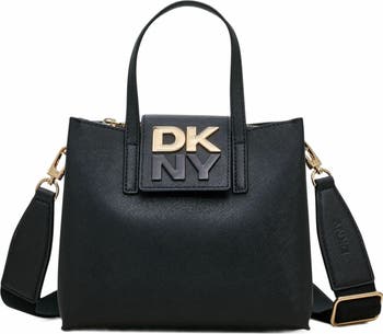 The Faye Small Satchel from DKNY exudes a timeless appeal with its structured silhouette and gold accents. Crafted from durable vinyl, this satchel is designed to withstand the demands of everyday wear.