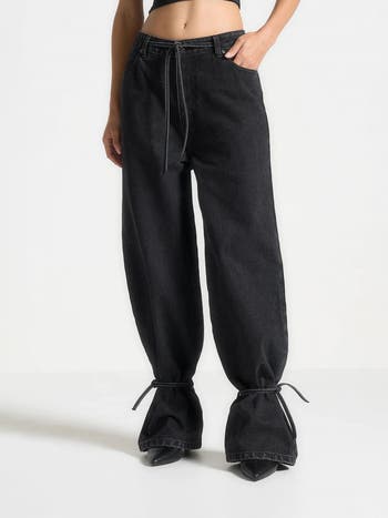 Elevate your look with our Wide Mid Rise Jeans. Featuring distinctive hem and waist tie details, these jeans bring a subtle touch of sophistication to any ensemble. Crafted from high-quality denim, they offer a perfect blend of comfort and style. Enhance your wardrobe with these versatile, statement-making jeans.