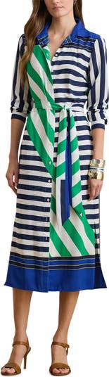 Multidirectional stripes lean into the dress-shirt heritage of this belted shirtdress styled with a tie belt.
