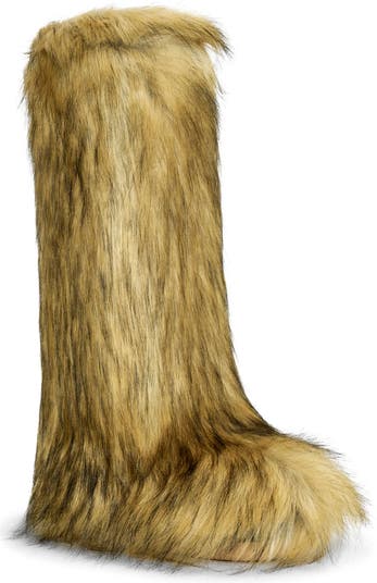 A platform-boosted boot goes fashion forward in extravagant faux fur all the way up the shaft.