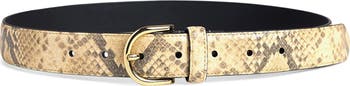 A gilded crescent buckle secures this snakeskin-print leather belt that will add edge and organic texture to your ensemble.