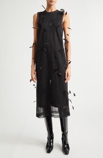 Fluttery feather appliqués bring a playful flight of fancy to a sleeveless silk knit dress done in a shift silhouettte topped with a sheer overlay.