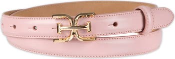 A monogram-shaped buckle puts a brand signature on this slender belt made from glossy patent leather.
