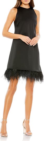 Satin trapeze dress with a high neckline, cutaway shoulders, and feather trim. A fun, swingy silhouette perfect for parties and special occasions.