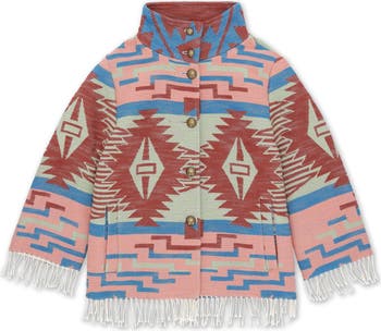 The WFEATHER hood is Navajo inspired. The fabric design is taken from vintage rugs from the personal archive of Alessia Giacobino and Alessandro Squarzi. The garment is made of 100% cotton. The entirely Italian production ensures a manufacturing excellence that is reflected in every detail of the garment, underlining how it was created to last over time and evolve together with the wearer. The WFEATHER has a regular fit, with 3/4 sleeves that end with fringes. The single-breasted buttoning, with aged brass boule buttons, perfectly matches the particular designs of the fabric, making the garment unique. On the back, the iconic Fortela stitching, made with orange thread, embodies the brand's philosophy: each piece is created to last and age together with the wearer, carrying with it a piece of history revisited in the light of Alessandro Squarzi's inspiration and study.