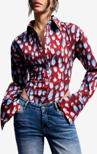 A stretch-cotton bodysuit reimagines the classic button-up shirt with a bold feather print, slim fit and dropped shoulders. It features snap closures at the bottom for a polished tucked-in look that stays perfectly in place.