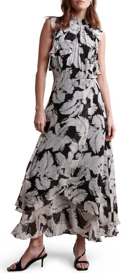 Black feather print dress in a midi silhouette with a high neckline, ruffle cap sleeves, ruffle wrap hemline with a zip and button fastening through the back.