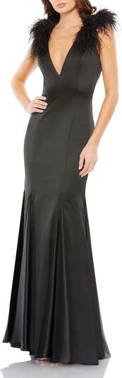 Satin gown with a flattering V-neckline and dramatic feather shoulder detail. A unique, elegant choice for any formal occasion.