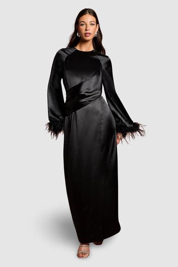 Elegance meets glamour in our feather trim satin maxi dress, perfect for evening occasions. Embrace sophistication effortlessly.