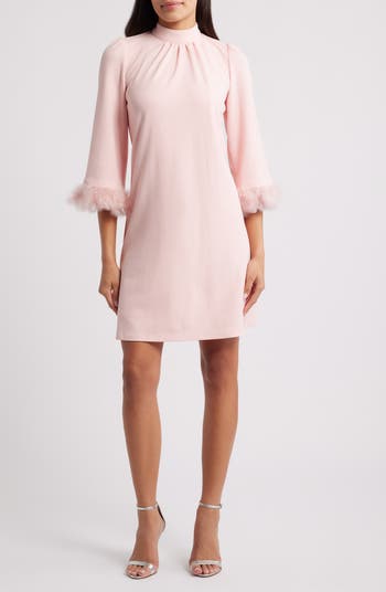 Feathery cuffs add texture and volume to this blushing sheath made with charming back bow.