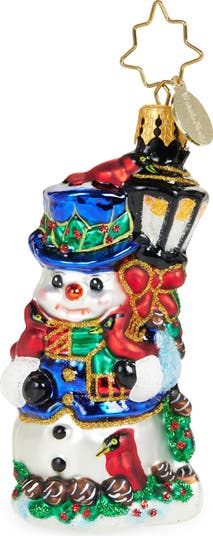 Crowned with a star-topped hanger, this glass tree ornament frames a dapper snowman in a top hat beside a glowing lamppost as holly leaves, pinecones and a crimson bow sparkle.