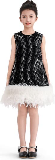 A dazzling contrast of textures and tones, this sleeveless dress pairs a sleek sequin bodice with a voluminous feathered hem—designed to turn heads at any upscale event.