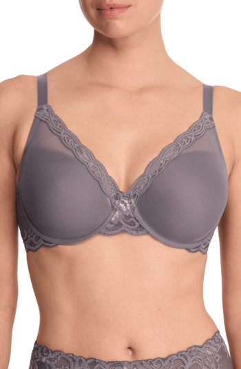 Natori Feathers signature lace plunge bra now designed and engineered for additional support and with extended sizes.