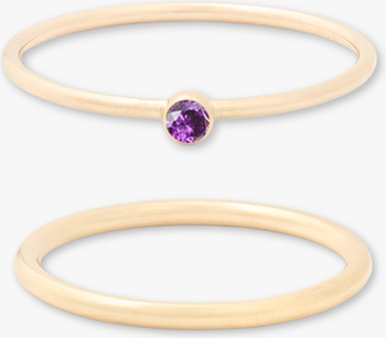 the dainty, high quailty gold stacking rings you'll never take off. This set includes two 14k gold filled rings, one plain and one with a february bezel set cubic zirconia birthstone.