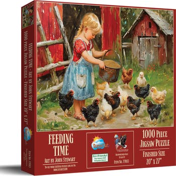 Step into the charming and inviting world of country life with the “Feeding Time” 1000-piece jigsaw puzzle by John Stewart. Ideal for adults, this beautiful piece of Americana resonates with anyone who has a profound appreciation for nature and simple joys. This puzzle offers not just a challenging hobby but a journey into nostalgic, simpler times with its dimensions of 20" x 27". Crafted by SunsOut Puzzles, these pieces are known for their superior quality, seamlessly interlocking and constructed from high-quality recycled cardboard. As a proud woman-owned small business, SunsOut stands out with unparalleled precision, and satisfyingly durable puzzles. SunsOut is engaged in sustainable practices, utilizing eco-friendly materials and soy-based inks to create a guilt-free creative escape, with crafted arts over the finest recycled-board that reflects the environmental responsibility. Moreover, the resilient spirit of this organization is observed in their unwavering dedication to client satisfaction, ensuring swift resolution for any concerns about missing or damaged pieces with its dedicated customer service. Ultimately, every puzzle celebrates not only the art of the craft but an enriching legacy of community support and entrepreneurial spirit. Unwind on a cozy afternoon, cherish the aesthetics of farm life or perhaps consider the “Feeding Time” puzzle as a thoughtful gift option. Indeed, this 1000 piece SunsOut jigsaw puzzle wholly embodies a love for rural aesthetic, heartwarming nostalgia, and staunch environmental consciousness.