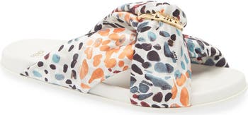 Knotted satin straps patterned with this season's Dew Drops print are cinched with logo-lettered ring hardware on this Italian-made slide sandal with a cushioned contoured footbed.