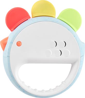 Your little one will love making noise with this playful tambourine toy designed to look like a chicken in bold and bright colors that are sure to catch their eye.