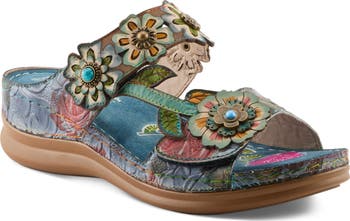 Floral appliqués bring colorful whimsy to a gorgeous hand-painted sandal crafted with a cushy footbed and supportive wedge.
