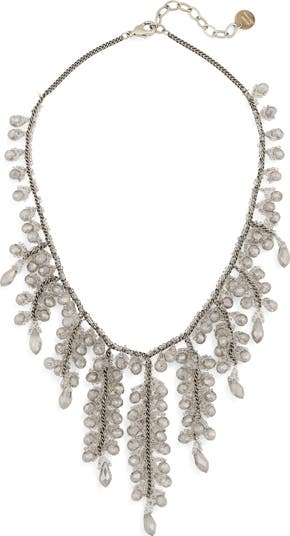 This hand-beaded necklace features gorgeous draping with graduated lines that move and catch light.