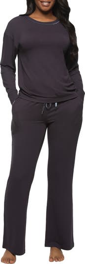 Look forward to lounging in these stretch-knit PJs that pair a long-sleeve top and pull-on pants for classic, comfy style.