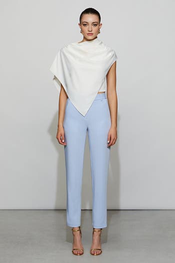 A sleek, tailored trouser in a soft pastel blue, designed for a polished and modern silhouette. Perfect for versatile styling, from office chic to evening elegance.